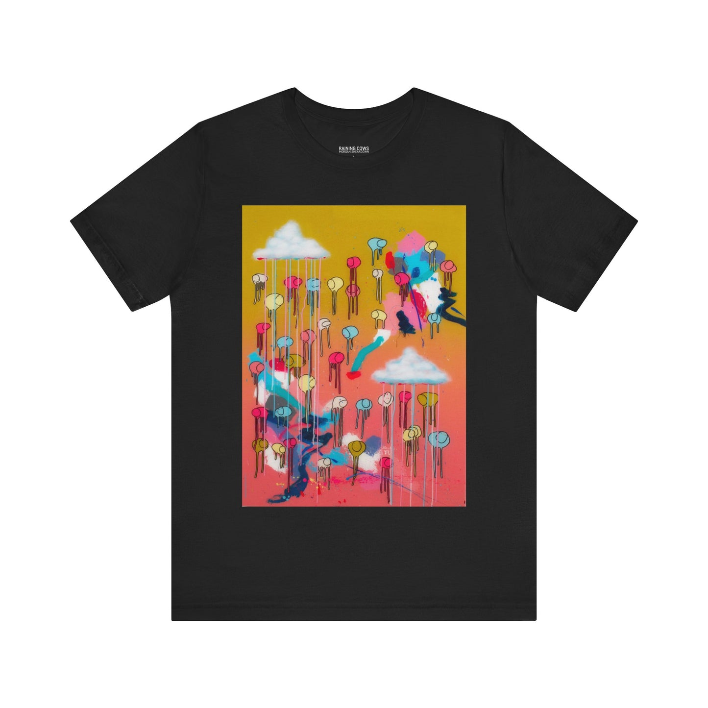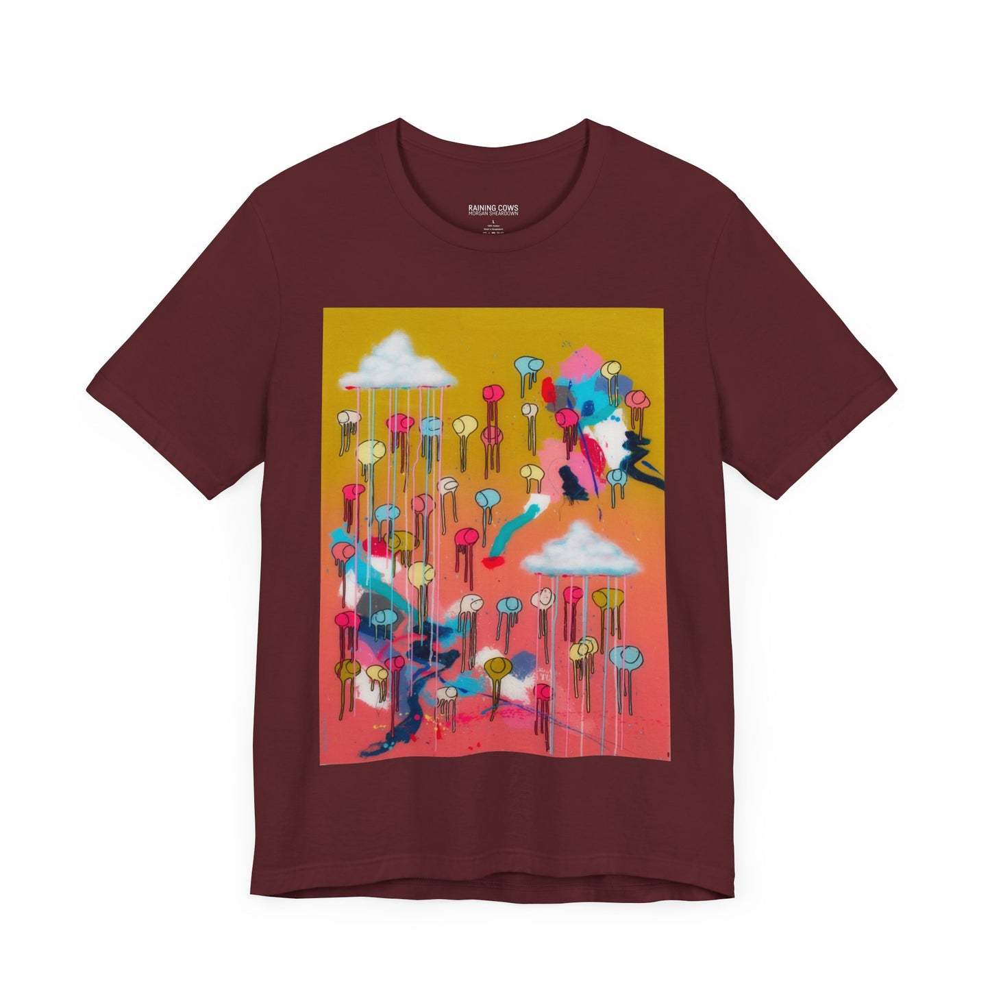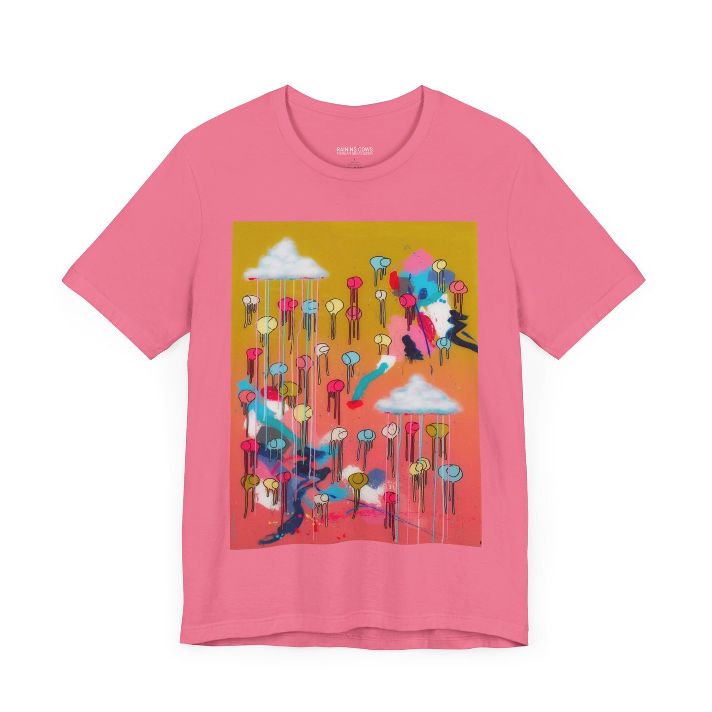 As an artist known for creating large-scale paintings, I’m excited to present a wearable version of my piece, RAINING COWS "Bubble Gum Sun". This t-shirt offers a fresh way to experience my art, and I hope it brings you as much joy as the original painting.