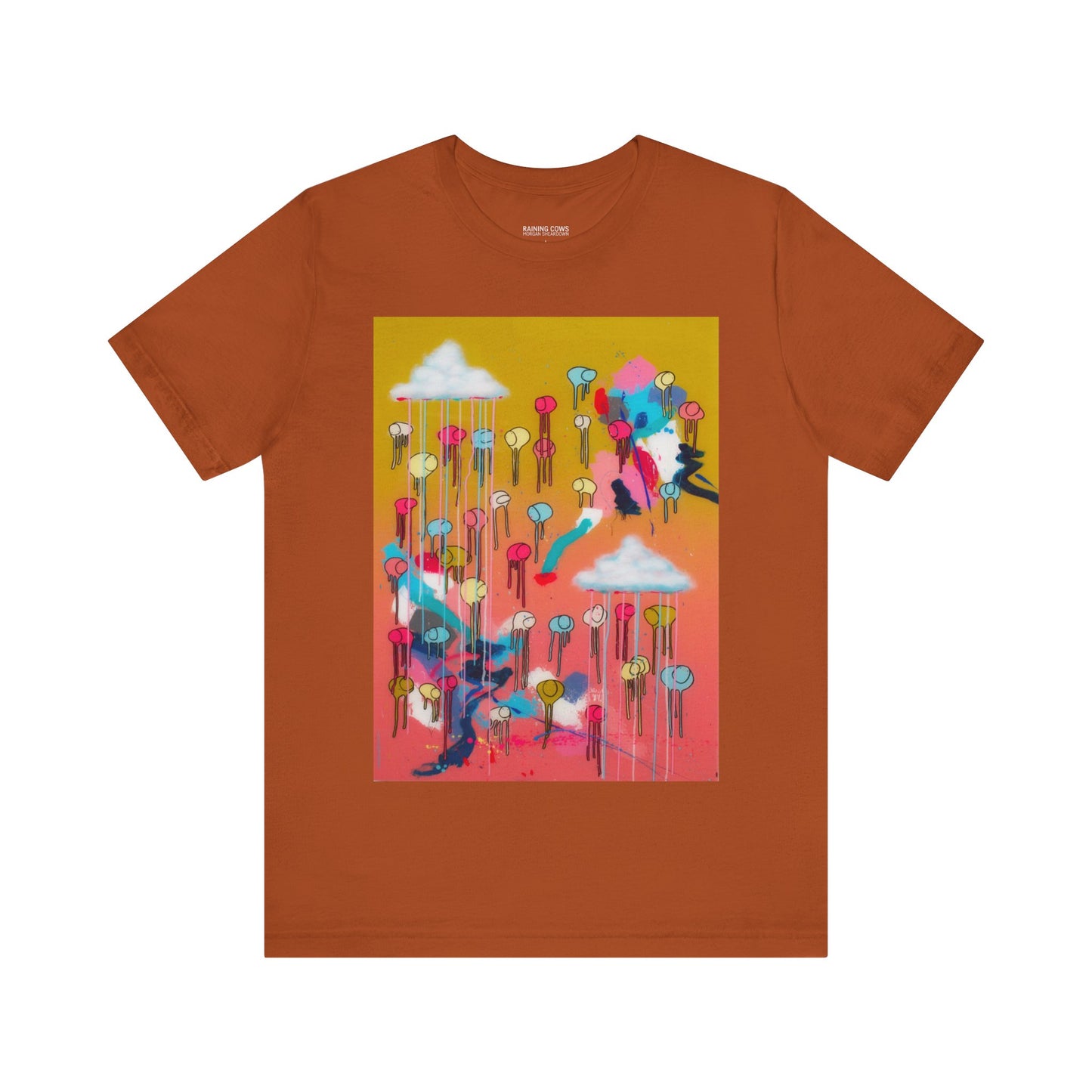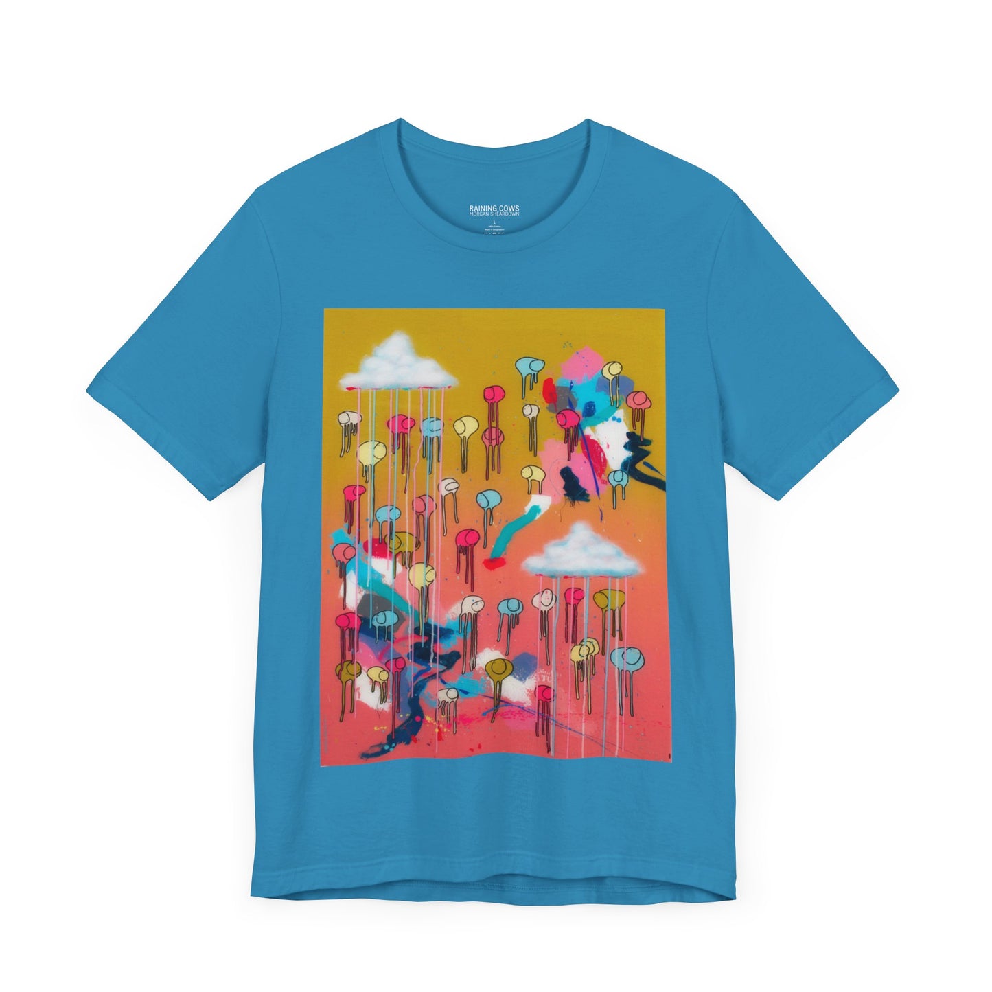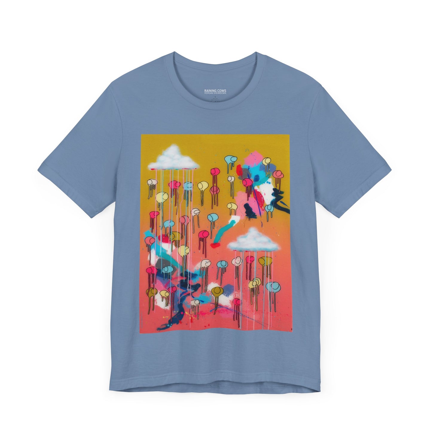 As an artist known for creating large-scale paintings, I’m excited to present a wearable version of my piece, RAINING COWS "Bubble Gum Sun". This t-shirt offers a fresh way to experience my art, and I hope it brings you as much joy as the original painting.